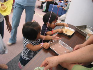 | そらちゃんと福祉まつりに行きました。これはおいものだんごにきな粉やココアパウダーをつけているところです。 | |