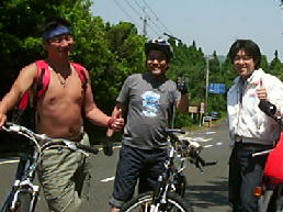 分岐のところで二人を発見!! 裸だよ、ワイルドだよ、体力勝負だよ、おもしれ〜!!! 写真の 裸族はイルカさん 中央が牧師さん この二人と並んで写真に収まると僕がすごく浮いている。元気玉でも作るんじゃないかってぐらい生命に溢れています。 それと熱心な「チームドルフィン」のオーナーでもあります。 | ||||||||