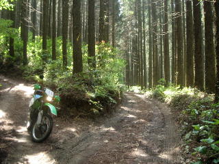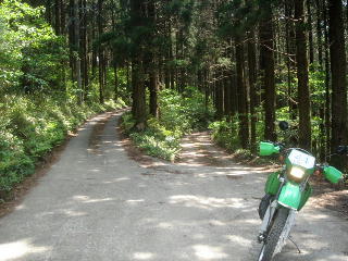 こんな感じの林道 普通、林道は寂しいもの、一人の時にはスピードは控えめに 道に敷かれる石は角張ったものが多く、ついつい視線が近くなりがち、初めて突入する林道は無事生還することが目標なのでノンビリいきましょう。 今日の装備は自分の主義に反して「ONロード」的なモード「長袖シャツ」に「Gパン」と「ハイカットな靴」 「ヘルメット」と「グローブ」はオフ用だけど安全性はかなり低いので注意が必要だ | |