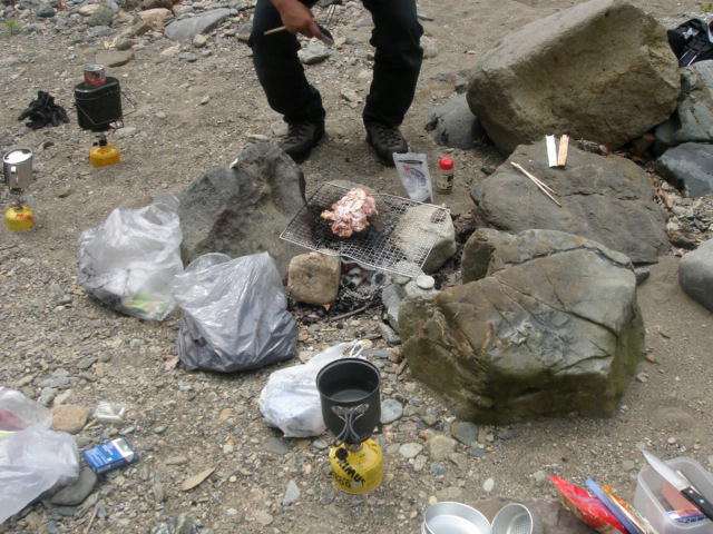 お昼ごはんのセッティング中にヤマメを下げた釣り人が通りかかりました。