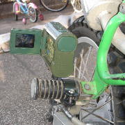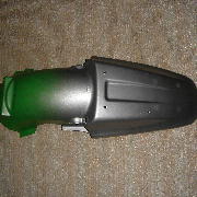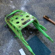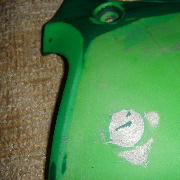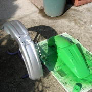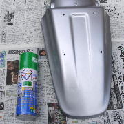 やっぱり、ラッカースプレーです。 でも、カワサキカラーの「ライムグリーン」に近い色を探してみて、「ジェムグリーン」を発見! そして、吹き付けてみるとなかなか良い色ですね。 |