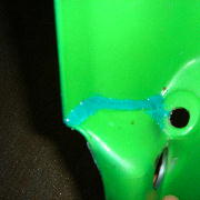 スクレーパーやサンドペーパーの使用で、旧ゼッケンプレートの糊やらを剥いでいきます。 下地が出てきます。すでに紫外線による変色及びプラスチックの変質があります。(粉を噴いている)とにかく削る! ついでに、新ゼッケンを貼る位置に凹みがあるのでグルーとパテで塞いでおきましょう。 |