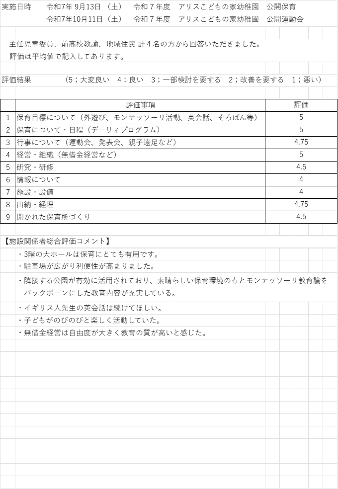 ・令和7年度保護者感想は、下記の施設関係者評価(未満児発表会)(以上児発表会)にあります。