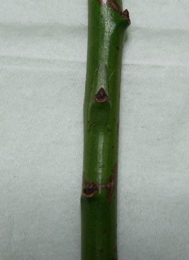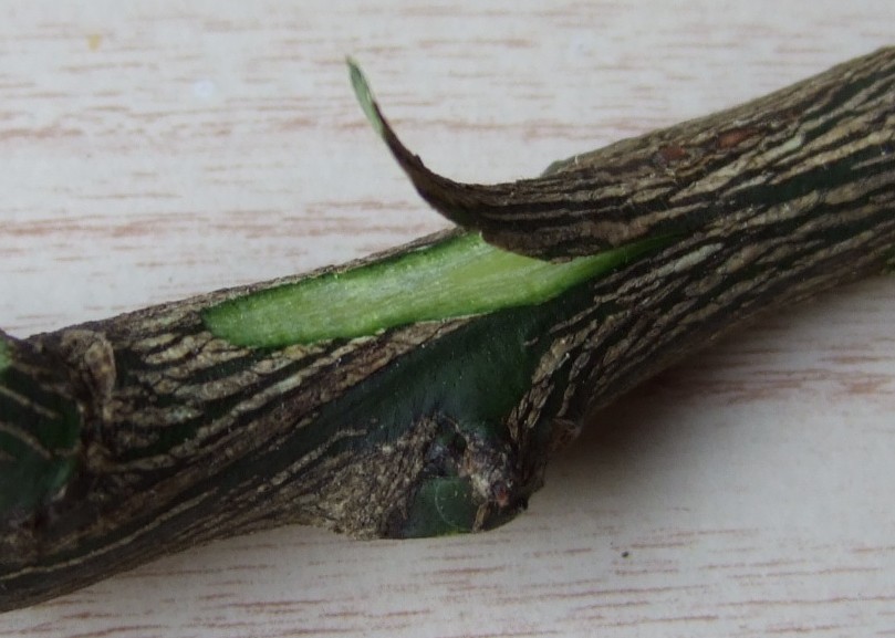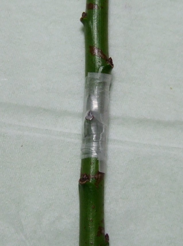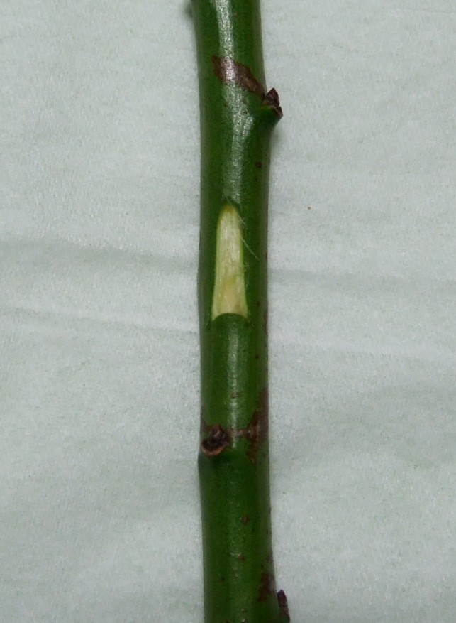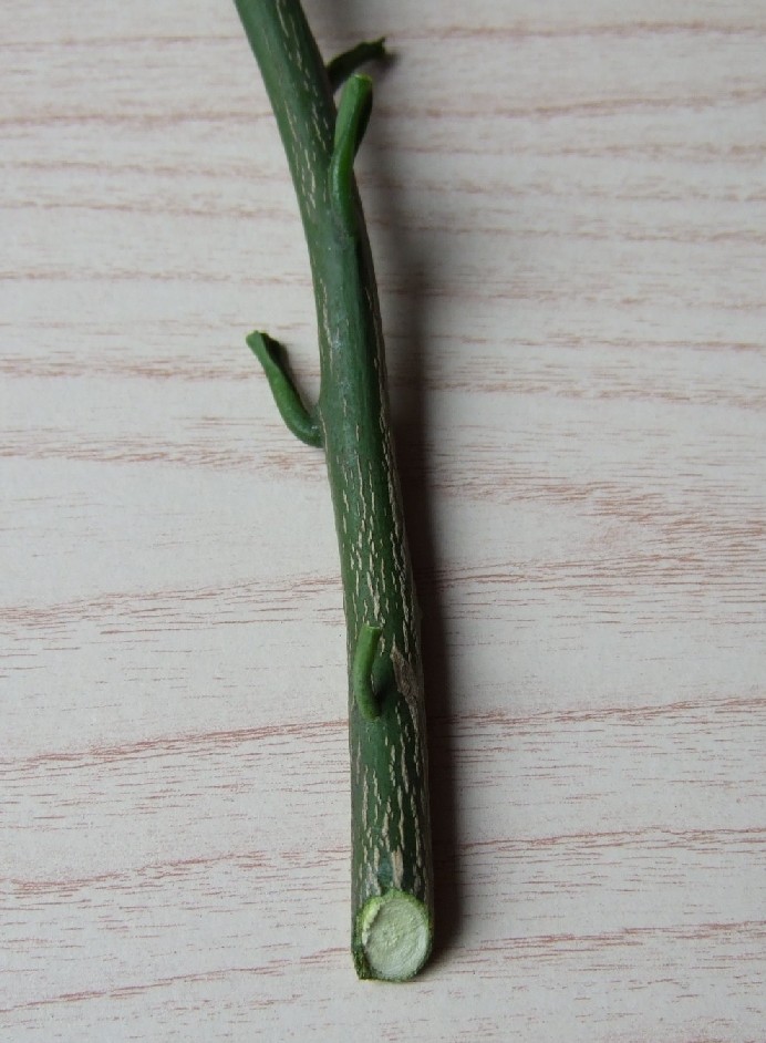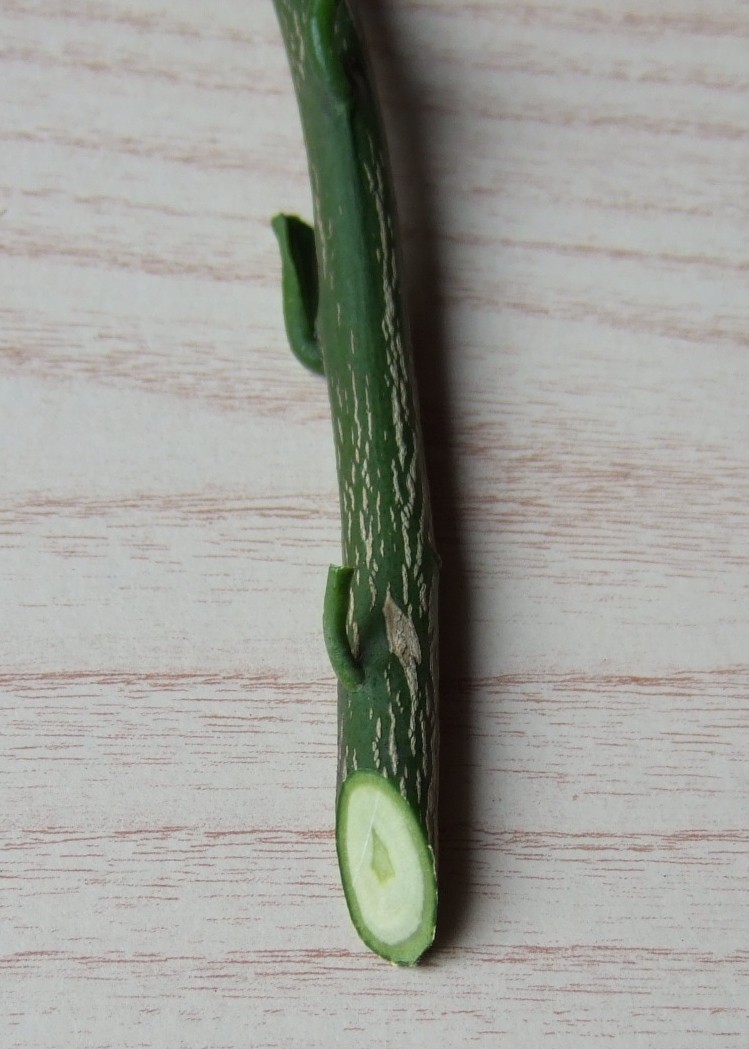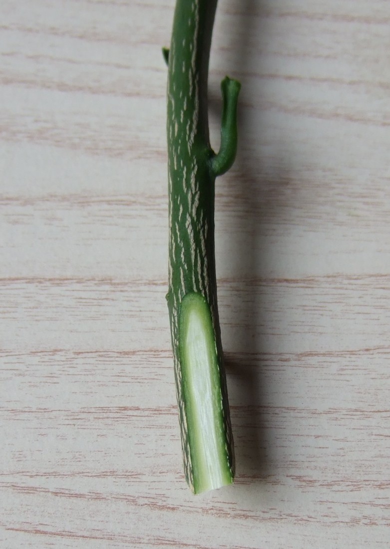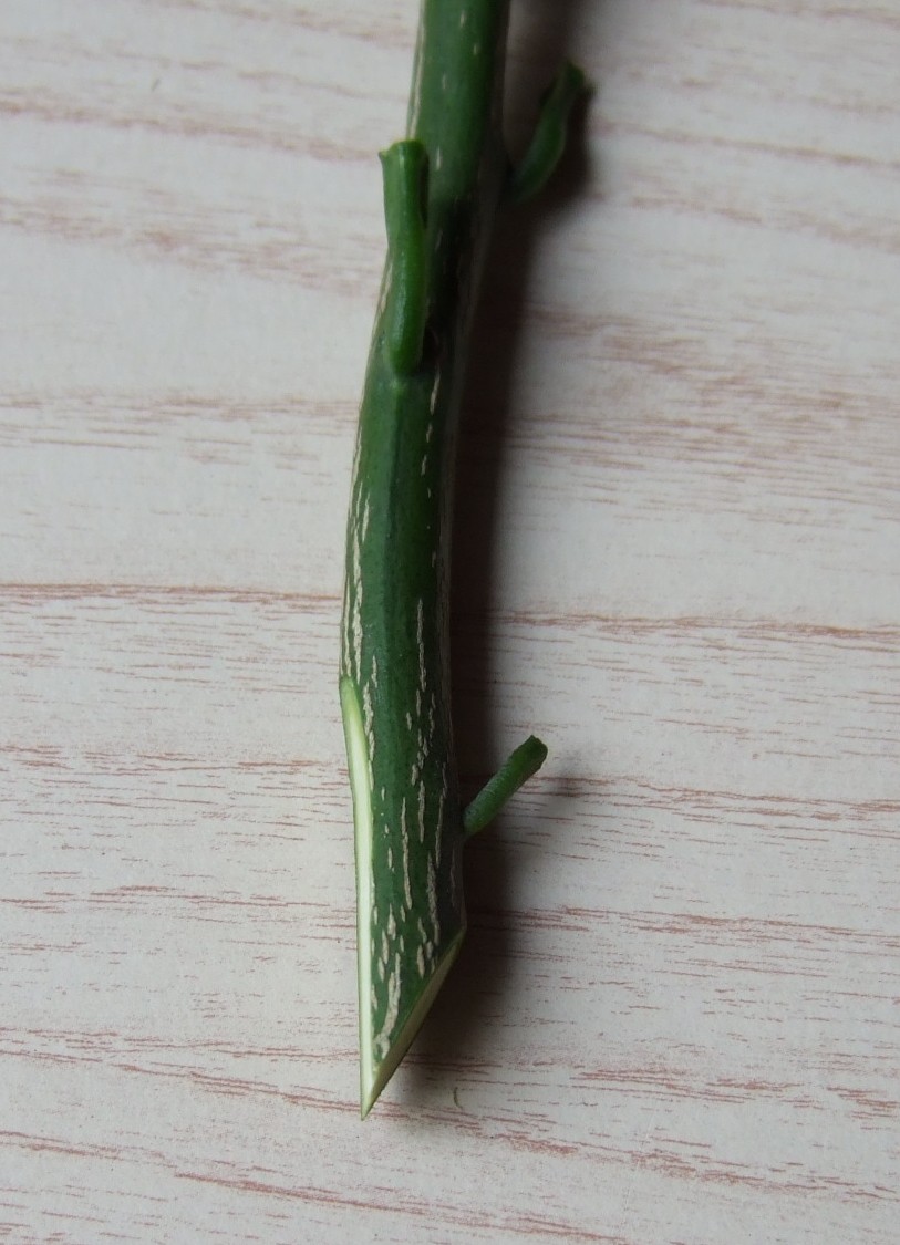 穂木は直径5mm前後のものが扱いやすいです。 葉柄だけ残し、葉は切り取ります。