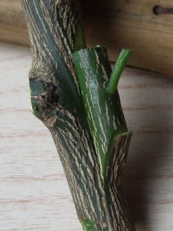 写真のものは、先端に切り接ぎ、その下に張り芽接ぎがしてあります。