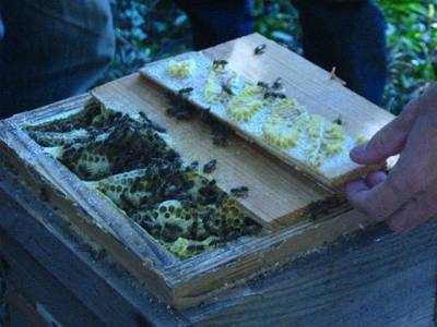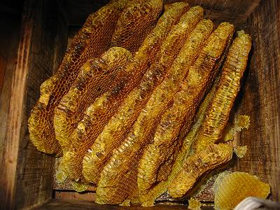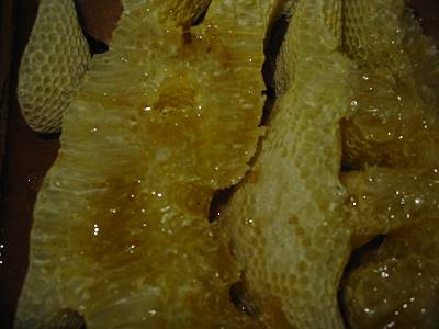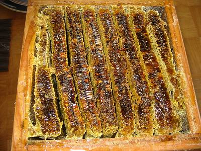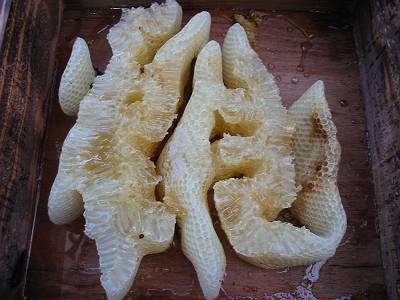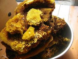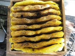 | 蜜を採った後の巣は蜜蝋にするのが適当ですが、 採蜜しない部分を乾燥させて巣枠に取り付けて、洋箱にミツバチを入れた時に使用すると蜂が早く巣枠に馴染みます。 しかし常温で巣板を保管するとスムシが繁殖しますので(すでに巣板にスムシがいると思ってください) 冷凍庫に2〜3日入れておくとか、スムシの駆除をしなければなりません。 花粉は茶漉しなど目の細かい金網に巣板ごと擦り付けると採取出来ます。(^_^)b |