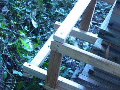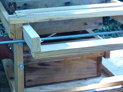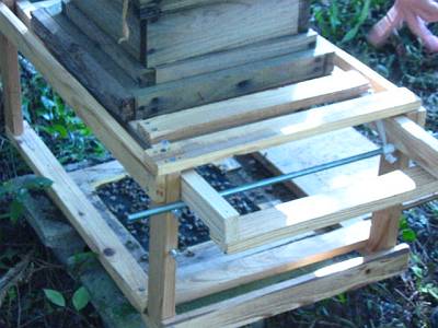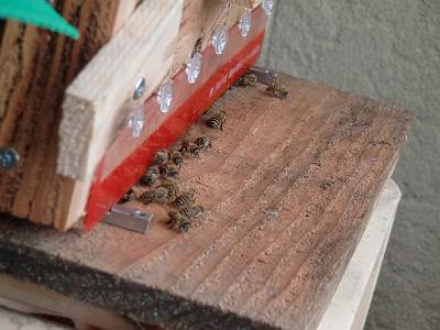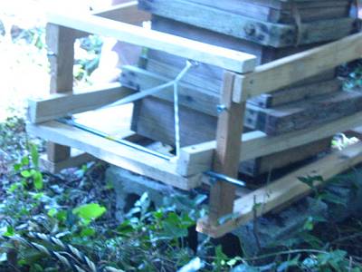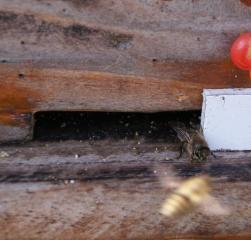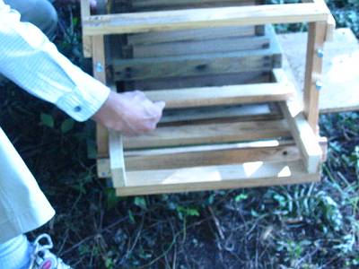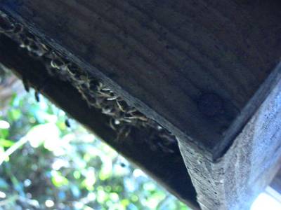 空き家の床下の待ち桶、蜜蝋のついた覗き穴だけの ようでしたけど? 巣門は作らず、5ミリ位の細い板を置いて、 4面から入るようにしている? |