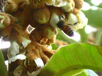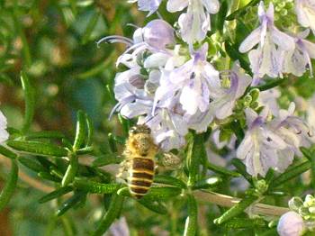 | ビワの花に来ていた日本ミツバチ | ローズマリーで蜜を吸う日本ミツバチ |