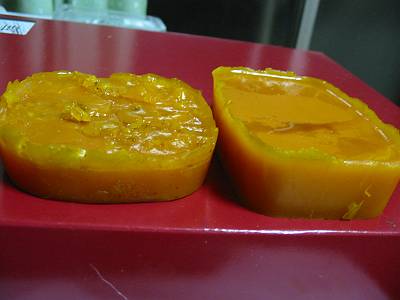 それをガーゼで漉して、ヨーグルトの容器に入れて固めて出来上がり。(画像:右の蜜蝋)