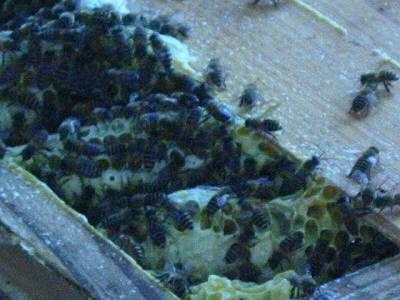 今春の第一分蜂群は勢いが良いので、7月に採蜜。継ぎ箱をする際、よろけて巣箱を投げ出し巣板が落ちた。