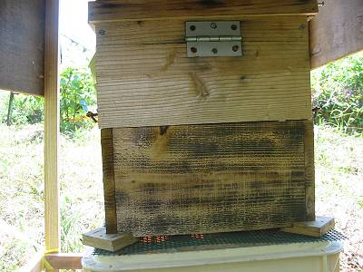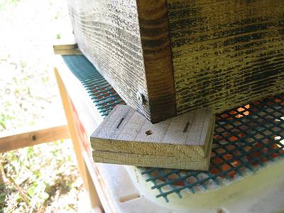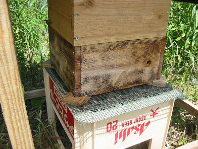 その後、元のビールケースの上の全面巣門のある巣箱を取り、新しい底板と巣門に蜂マイッターを取り付けた巣箱を置く。