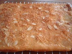 ビーネンステッヒは天板いっぱいにのばしたパン生地の上にキャラメルナッツをのせて焼いたもの。 トッピングはココナッツとスライスアーモンド。 パン教室でも習いましたが,これは友達から教えてもらったレシピで作ったものです。 小さくカットするので大勢の時は便利です。 こちらもついつい食べ過ぎてしまうくらいのおいしさ・・。 「おいしいから食べてみて〜」とすすめたら,あっという間に売り切れてしまいました。