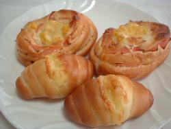 小さいロールパンの方はウインナーに巻き付け,ピザチーズをのせたものです。