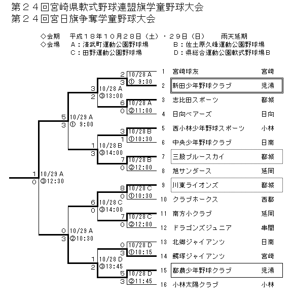 ◆1回戦(10/28) 宮崎球友(宮崎) 0000020│2 新田少年野球クラブ(児湯) 102000×│3 志比田スポーツ(都城) 4100100│6 日向ベアーズ(日向) 0000000│0 西小林少年野球(小林) 1002000│3 中央少年野球クラブ(日南) 0010000│1 三股ブルースカイ(都城) 010033│7 旭サンダース(延岡) 000000│0 クラブホークス(西都) 00000│0 川東ライオンズ(都城) 2303×│8 ドラゴンズジュニア(串間) 00000│0 南方小クラブ(延岡) 5110×│7 北郷ジャイアンツ(日南) 0000000│0 鰐塚ジャイアンツ(宮崎) 010200×│3 小林太陽クラブ(小林) 0021000│3 都農少年野球クラブ(児湯) 310010×│5 ◆2回戦(10/28) 新田少年野球クラブ(児湯) 1010001│3 志比田スポーツ(都城) 0002000│2 西小林少年野球(小林) 0100000│1 三股ブルースカイ(都城) 000003×│3 南方小クラブ(延岡) 0000000│0 川東ライオンズ(都城) 201102×│6 都農少年野球クラブ(児湯) 0010010│2 鰐塚ジャイアンツ(宮崎) 0100000│1 ◆準決勝(10/29) 三股ブルースカイ(都城) 1001000│2 新田少年野球クラブ(児湯) 131000×│5 都農少年野球クラブ(児湯) 1000011│3 川東ライオンズ(都城) 0000000│0 ◆決 勝(10/29) 都農少年野球クラブ(児湯) 0000000│0 新田少年野球クラブ(児湯) 100000×│1