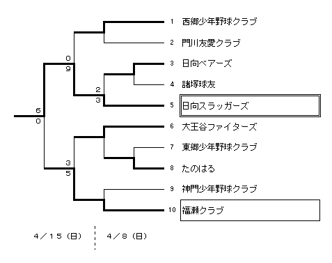 ◆準決勝(4/15) 西郷少年野球クラブ 00000│0 日向スラッガーズ 3501×│9 本塁打:川口2(ス) 大王谷ファイターズ 1000002│3 福瀬クラブ 300200×│5 本塁打:長池(福) 三塁打:直野(福) ◆決 勝(4/15) 日向スラッガーズ 0013011│6 福瀬クラブ 0000000│0 本塁打:川口(ス) 三塁打:川口(ス) 高橋(福)