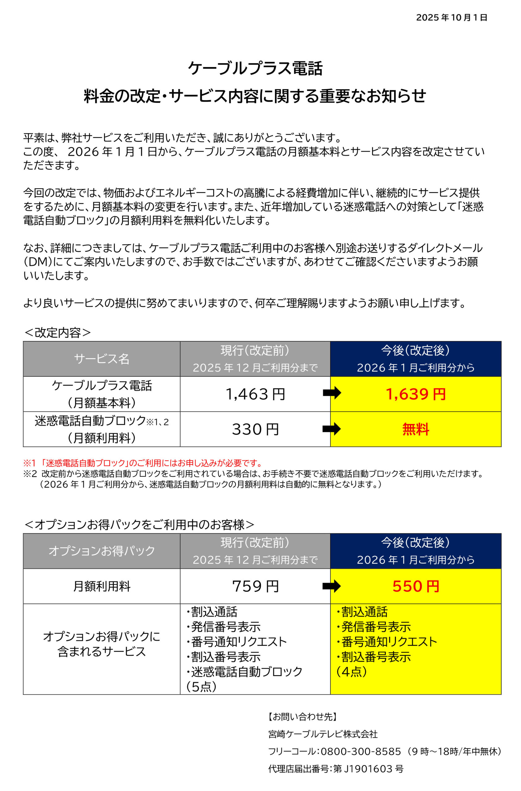 ケーブルプラス電話 料金の改定・サービス内容に関する重要なお知らせ