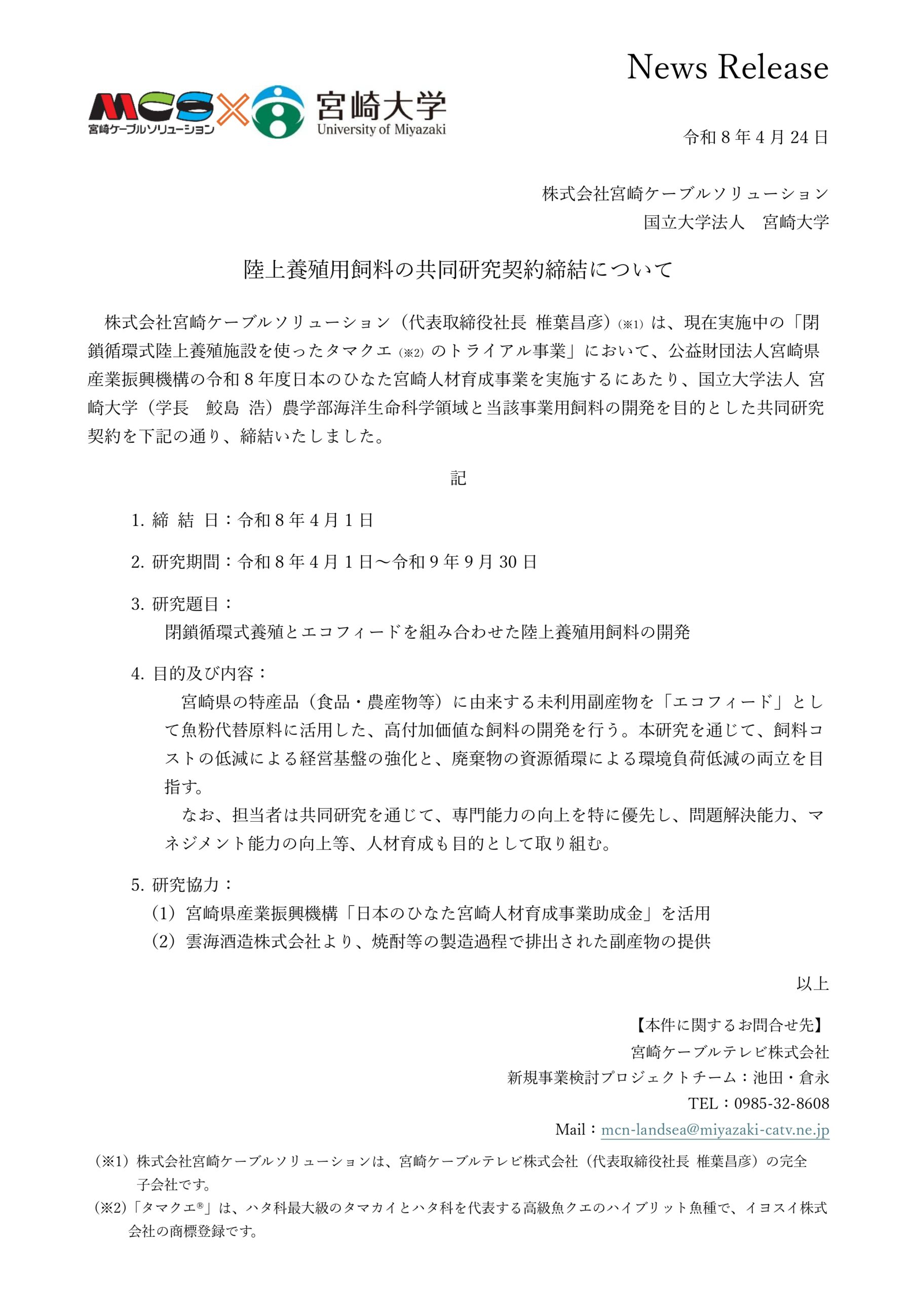 陸上養殖用飼料の共同研究契約締結について