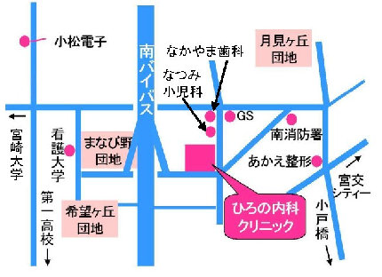 南バイパスの空港・青島方面からはセルフサービスのガソリンスタンド角を左折、突き当たりを右折です。
