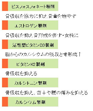 骨粗鬆症の薬の作用は大きく分けて2つあります。骨の吸収を抑える薬と骨の形成を促進する作用です。骨代謝マーカーで骨の吸収が進んでいる人には、それを押さえる作用のある薬を、また、骨の形成が進みにくい人にはそれを進める薬を使います。 そのほか骨粗鬆症による痛みを抑える作用のある薬や、腸管からのカルシウムの吸収を助ける作用、骨の構造を改善して骨折を起こしにくくする作用の薬があります。また、骨の形成には女性ホルモンも関係しているので、閉経後の女性には女性ホルモンを補充することもあります。