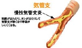 慢性気管支炎:気道の表面が炎症を起こし、粘液の分泌が多くなる場合がほとんどです。また、気道の壁が厚くなって気道が狭くなり、空気の通りが悪くなります。(図-3)