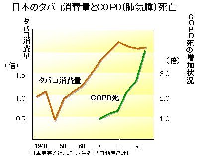 COPDの原因の90%以上は喫煙です。アメリカではタバコ消費量の増加に約10年遅れて、肺癌による死亡が増加し、さらに10年遅れて、COPDによる死亡が増加しました。日本でも同じようなことが起きています。(図-1)またCOPDは中高齢者に発症する病気です。喫煙者が増える、喫煙量が増える、高齢者が増える事により、COPD患者は増加の一途をたどるのです。特に日本は先進国の中で喫煙率が高く(男性の58%、女性の13%