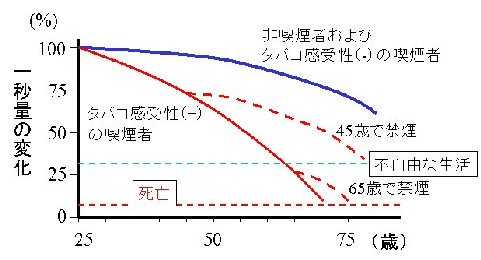 COPD患者(タバコ感受性+の喫煙者)における1秒量(一秒間に思い切り吐く呼気量)は経年的に確実に低下していきます。(図-6)
