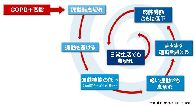 咳や痰が続き、運動時の息切れが出現し、次第に呼吸困難が進行して呼吸不全や呼吸器感染症で命を落とすこともあります。特に息切れはQOL(生活の質)に影響し、徐々に運動をしなくなることによりますます症状が進行します。 (図-5)