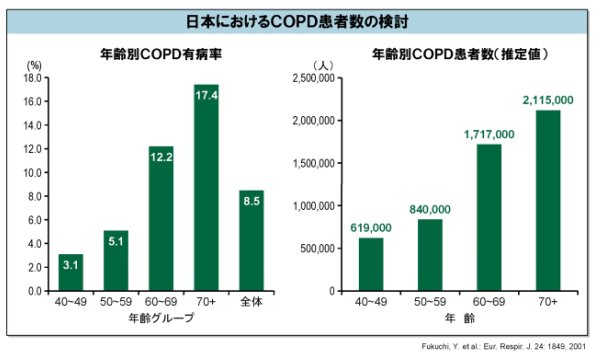 COPDの日本における有病率を調査する目的で、順天堂大学呼吸器内科の福地先生を中心に大規模な疫学調査、ナイススタディーが実施されました。その結果、40歳以上の8.5%がCOPDであり、全国には潜在患者を含め約530万人のCOPD患者が存在すると報告されました。(図-7)