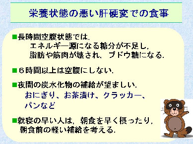 肝硬変では肝臓に蓄積されるエネルギー量が少ないため、容易に飢餓状態になり、脂肪や筋肉がエネルギー源として燃やされます。そのため夜間や早朝のこむら返りや手のつりなどが現れます。したがって、4回以上の分食にして、少量ずつこまめに食事をすることがよいでしょう。また眠前に軽食を摂ることも勧められます。