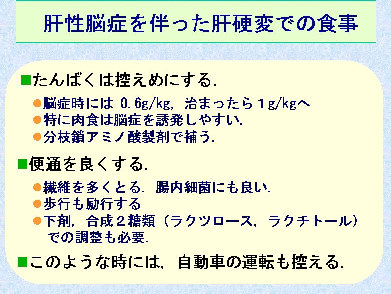 タンパク質は普通にとってもよいですが、肝性脳症や黄疸などがあるときは控えめにします。タンパク質を分解してアミノ酸として吸収しますが、その過程で腸内で有害なアンモニアが発生します。通常アンモニアは肝臓で解毒されますが、肝機能の低下した肝硬変ではアンモニアの解毒に筋肉が使われ、そこで分岐鎖アミノ酸が消費されるため、体内のアミノ酸のバランスが崩れます。その結果、肝臓でタンパクの合成がされなくなり、浮腫や腹水が出現したり、脳症が悪化したりします。このくずれたアミノ酸バランスを戻すためには食事の注意だけでは困難なので、特殊アミノ酸製剤を食事の一部に加えて服用します。