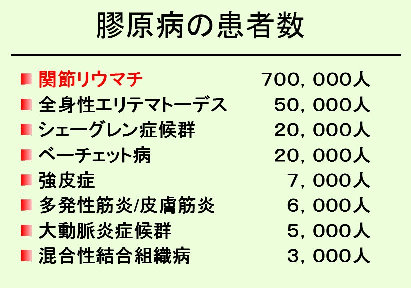 膠原病の患者数は表−2のようになっており、関節リウマチが最も多く、約70万人と推定されます。これら膠原病の多くは厚生労働省が特定疾患治療研究対象疾患