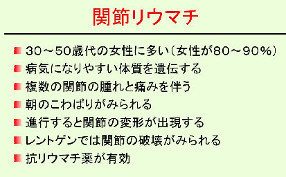 朝起きたとき関節がこわばって動かしにくく、使っているうちに徐々に楽になる「朝のこわばり」がみられます。関節のこわばりは、長時間座っていたり、長い間関節を動かさないでいた後にもみられます。軽快・再燃を繰り返しながら慢性の経過をたどりますが、中には自然に治癒する場合もあります(約30%)。 進行すると関節の変形がみられ、レントゲンでは関節の破壊像がみられます。(表-3)