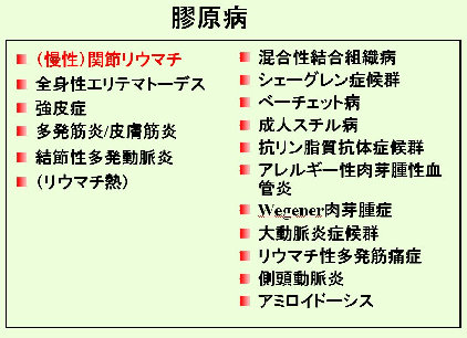 膠原病は特定の臓器が障害される疾患(肝炎、甲状腺炎など)ではなく、全身の結合組織がおかされる疾患群で表−1のように分類されます。(左の6疾患は古典的膠原病と呼ばれています。)