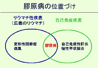 リウマチ性疾患は関節・骨・筋肉のこわばり・腫(は)れ・痛みなどの症状を呈する疾患群で「広義のリウマチ」です。その代表疾患として変形性関節症・痛風などがあります。また、膠原病は全身の関節の痛みが高頻度に見られることから、膠原病のほとんどはリウマチ性疾患に分類されます。膠原病の代表的疾患が関節リウマチなのです。またこれら膠原病は自分自身の体の構成成分と反応してしまうリンパ球によって引き起こされる(自己免疫)と考えられるので自己免疫性疾患にも分類されます。(図−1)