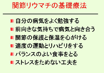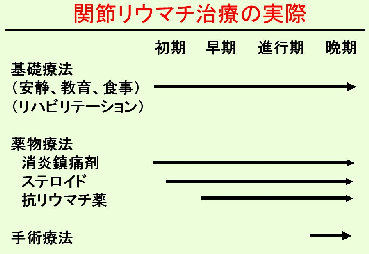 関節リウマチの治療は病気の進行度にあわせて行います(図−4)。 一番大事なことは基礎療法であり、病気に対する知識と理解を深めたり、病気の進行を抑えるような日常生活上の注意が必要です(表−6)