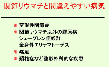 多関節の痛みと腫れ、こわばりが長期間続き、リウマチ反応と炎症反応が陽性であれば関節リウマチの可能性が高いといえるでしょう。炎症反応とはCRP、赤沈(血沈)などのことで、炎症(赤く腫れ、痛み、発熱を伴う変化)がおきるとこれらが陽性になります。関節リウマチでは病気の活動性と炎症反応が相関するので、炎症反応が治療の指標となります。関節リウマチと間違えやすい病気には表−5のような疾患が挙げられます。