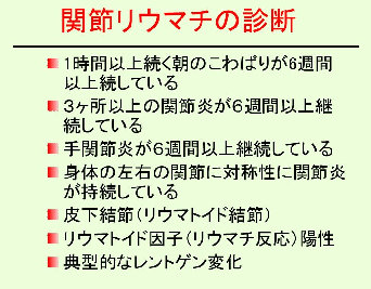 関節リウマチの診断にはアメリカリウマチ学会の診断基準(表−4)が用いられています。このうち4項目以上満たせば関節リウマチと診断します。