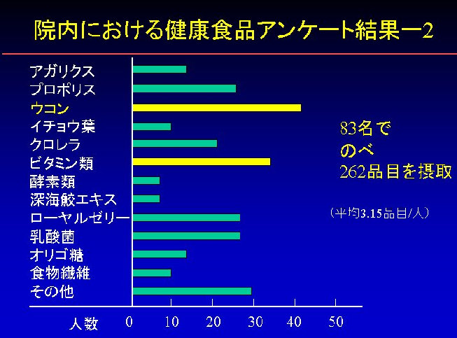 通院患者さんというバイアスがかかっているので、一般の方がこれほど多く健康食品を摂っているかどうかはわかりませんが、それにしても多くの方がしかも複数の健康食品を試しているのには驚きです。