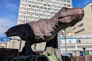 福井駅前では、おなじみの恐竜がお出迎え | 広大な遺跡が広がる一乗谷 | 当時の町並みが復元されています |