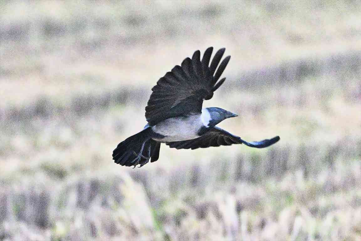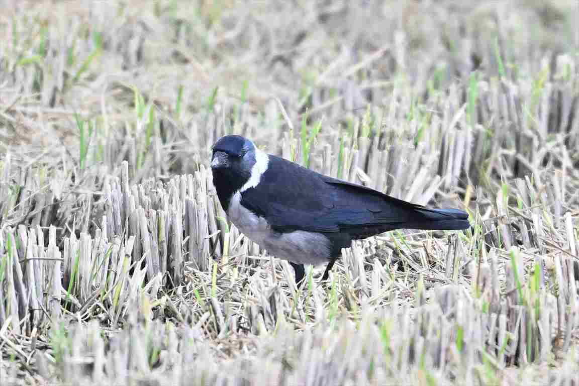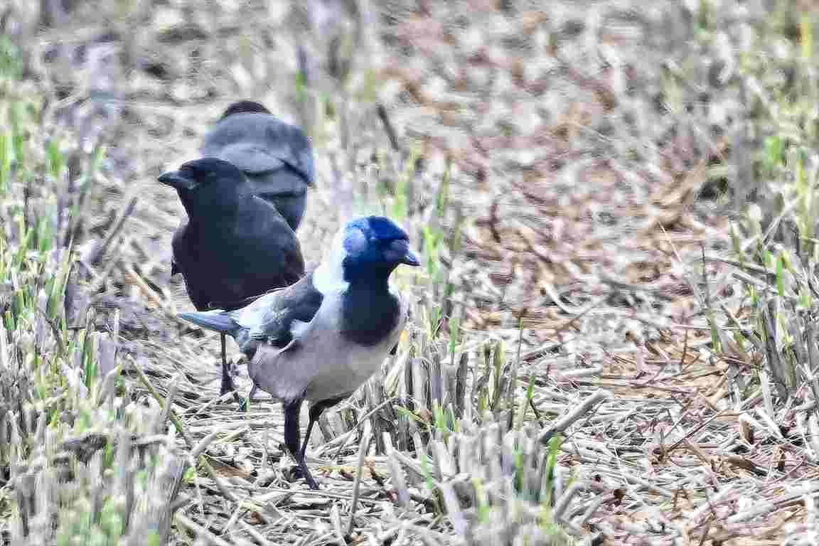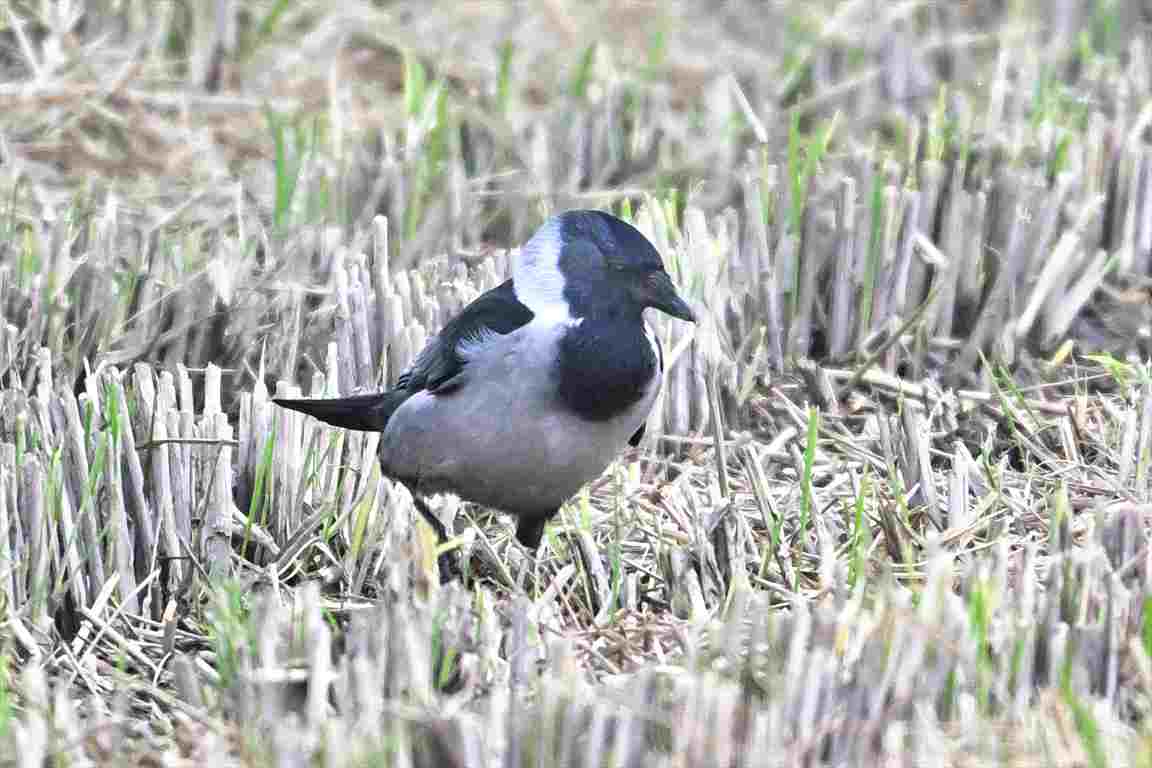 刈り取りの終わった水田にたくさんのカラスが降り立っていた。ミヤマガラスとコクマルガラスのようだ。