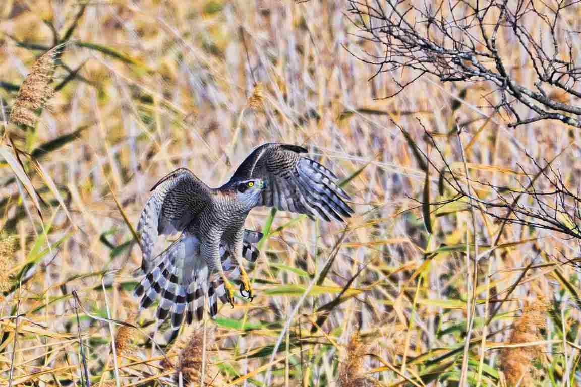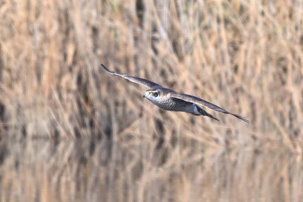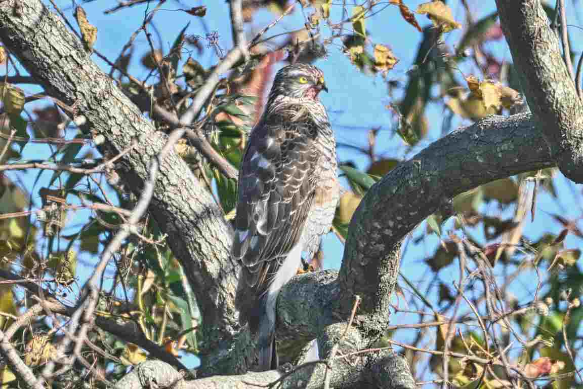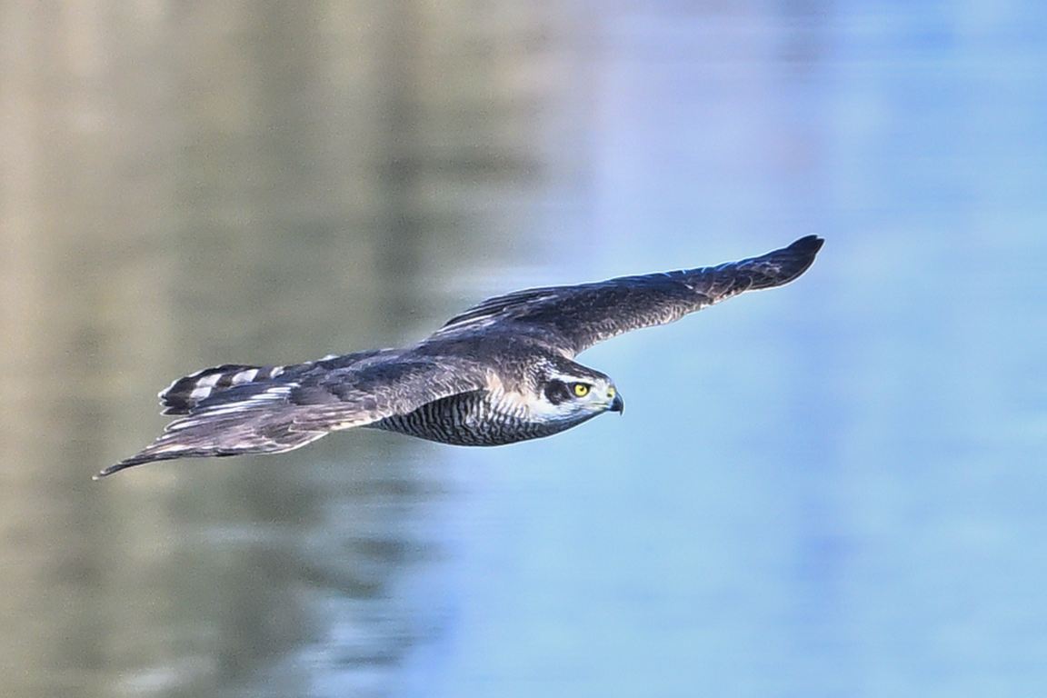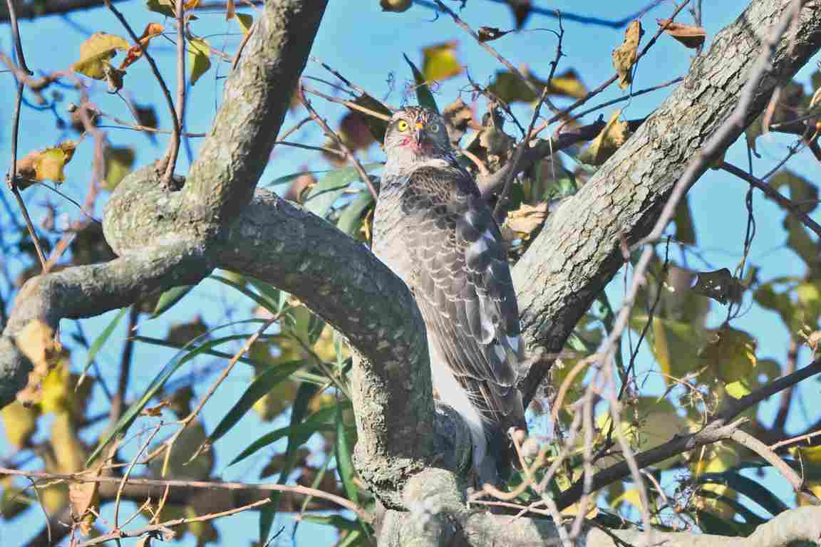 ハイタカがグライダーのように滑空して、池の中央付近の樹にとまった。