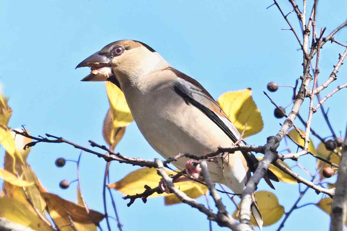 イカルがおいしそうに食事するのを初めて見ました(^o^)。*欅の実を見るのも初めてで実がなることも知りませんでした(^o^)。