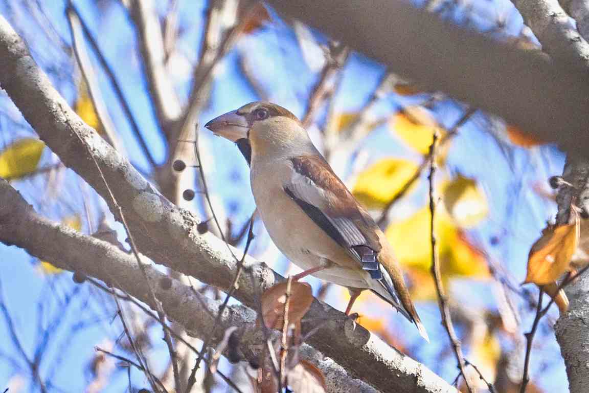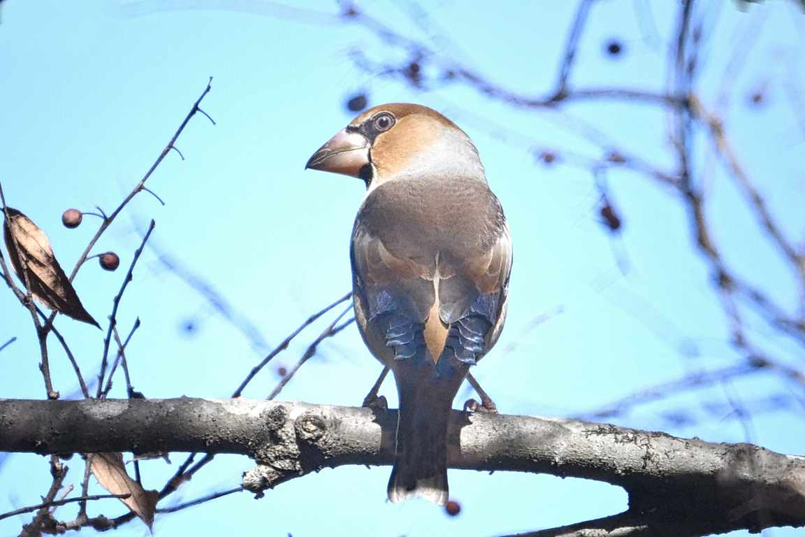 よく散歩する公園で杉の中にイカルを見つけた。ジッと見ているとすぐ横の欅にとまり、その実を食べ始めた。