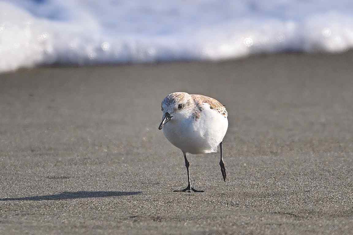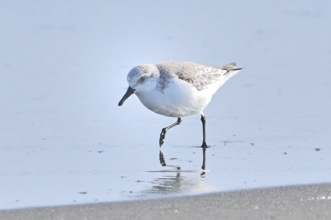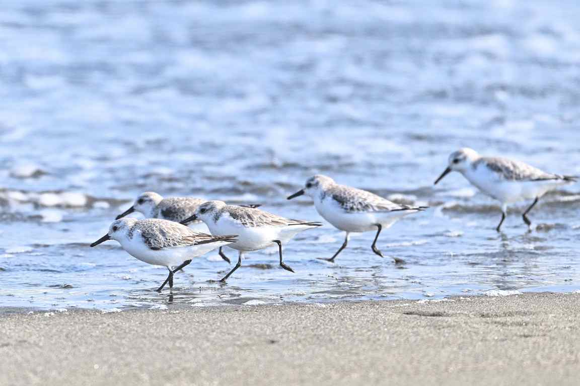 遠くから撮影して引き返すことにし、後ろを見たらミユビシギが集団で波打ち際で採餌!